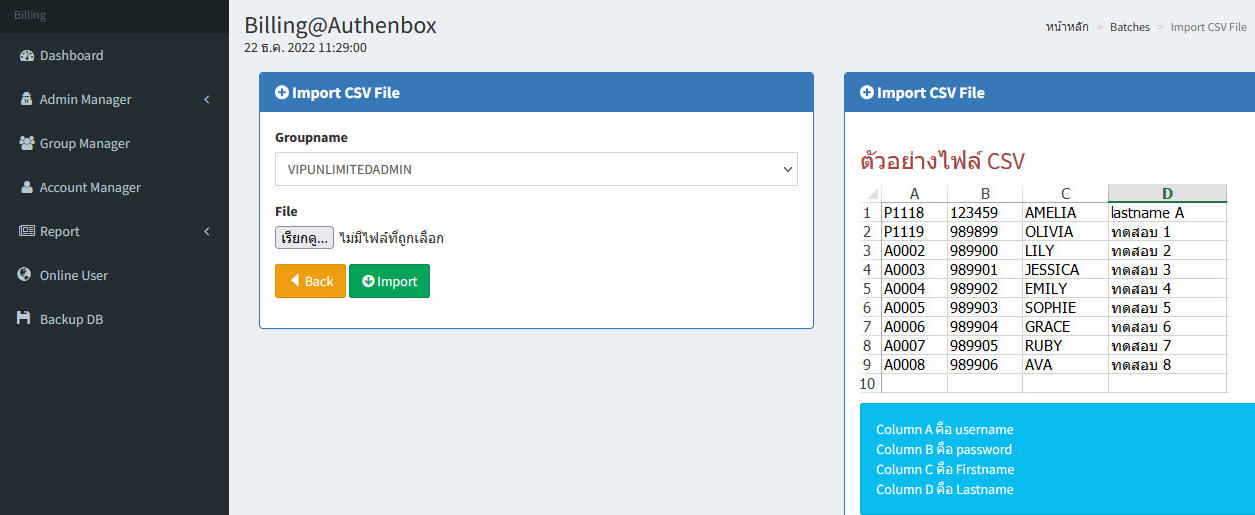 - สามารถ import user โดยนำเข้าไฟล์ csv , auto generate account ออกบัตรเป็น คูปอง pdf ได้