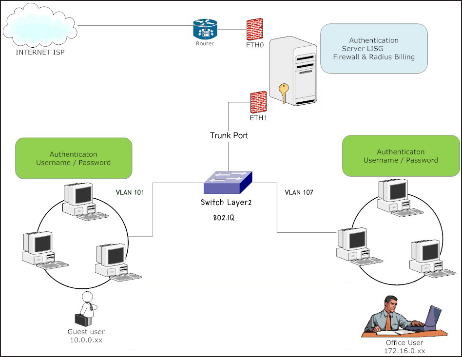 Lisg 3.0 สามารถ ประยุกต์ใช้งาน บนระบบเครือข่าย ที่ต้องการ มีเครือข่าย LAN ภายใน เกินกว่า 1 วงขึ้นไป โดย LISG ออกแบบมาสำหรับ ทำ Client Interface มากกว่า 1 Interface ได้